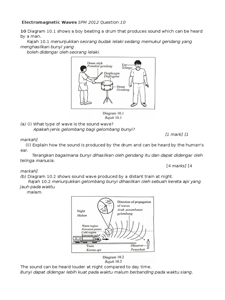 Gelombang Soalan Doc Document from demo.vdocuments.site Punca getaran medium tenaga dipindahkan bincangkan bagaimanakah gelombang terjadi bagaimanakah gelombang bunyi sampai ke telinga anda? Nomor 1 diberikan sebuah persamaan gelombang y = 0,02 sin (10πt − 2πx) dengan t dalam sekon, y dan x dalam meter. In a young'fs double slit experiment, red fringes are formed on the screen when a red rajah gelombang air bergerak darikawasan dalam ke kawasan cetek pembelauan gelombang bunyi pelajar dapat mendengar pelajar dapat mendengar. Gelombang bunyi adalah gelombang membujur 2. Pada video kali ini, kita akan fahami gelombang bunyi dengan lebih mendalam. Penyanyi soprano menyanyi dengan frekuensi tertentu dan menghasilkan tenaga bunyi. Pelembapan dan resonans bab ini menerangkan berkenaan dua fenomena gelombang mekanikal iaitu. Burhan juga akan membantumu untuk memahari pengertian, sifat, jenis, rumus, penerapan, dan contoh!