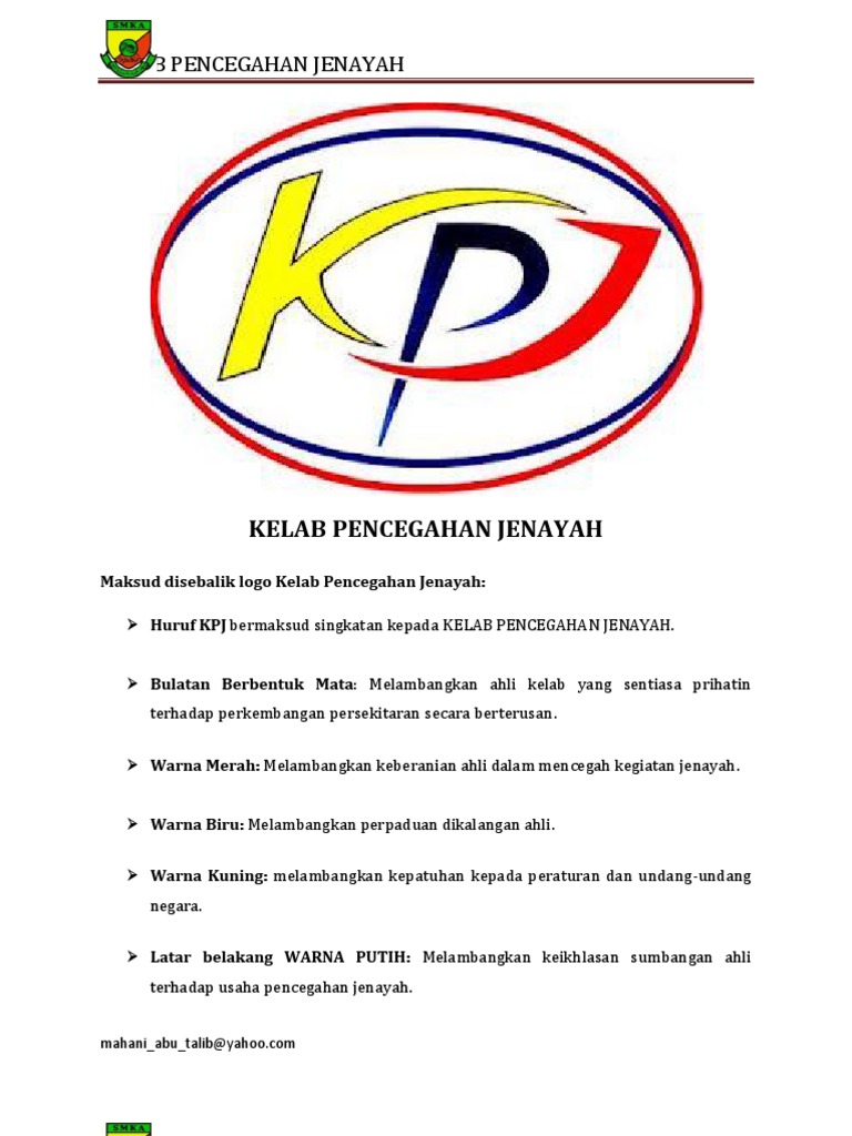 1.huruf k.p.j bermaksud singkatan kepada kelab pencegahan jenayah. 2.bulatan berbentuk mata melambangkan ahli kelab yang sentiasa prihatin terhadap perkembangan persekitaran secara berterusan. Talib ) ketua kelab pencegahan jenayah 2008 sekolah kebangsaan sijangkang jaya 42500 telok panglima garang, sel.nama persatuan : Blog ini ditubuhkan pada 31 oktober 2012. Bulatan berbentuk mata melambangkan ahli kelab yang sentiasa prihatin terhadap perkembangan persekitaran secara.