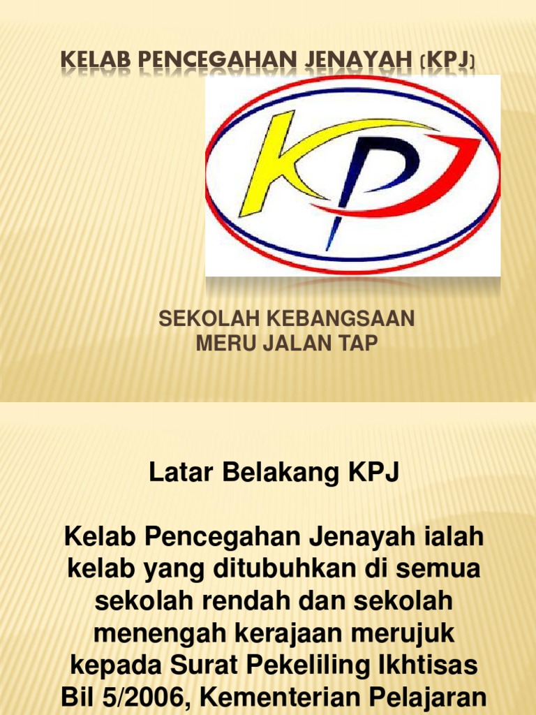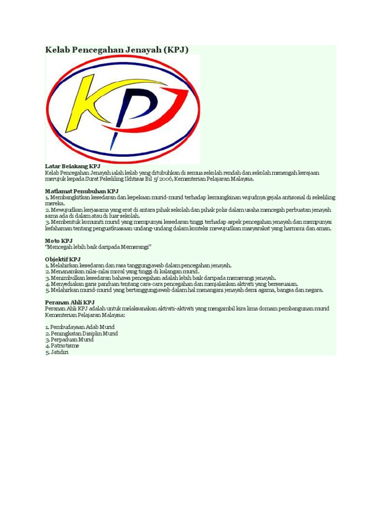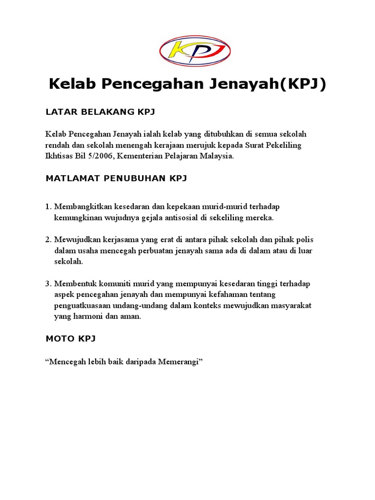 Kelab Pencegahan Jenayah Site Title from nurhanabatrisyia.files.wordpress.com Huruf k.p.j ialah singkatan kelab pencegahan jenayah. Latar belakang kpj kelab pencegahan jenayah ialah kelab yang ditubuhkan di semua sekolah rendah dan sekolah menengah kerajaan merujuk kepada surat pekeliling ikhtisas bil 5/2006, kementerian pelajaran malaysia. Latar belakang kpj kelab pencegahan jenayah ialah kelab yang ditubuhkan di semua sekolah rendah dan sekolah menengah kerajaan merujuk kepada surat pekeliling ikhtisas bil 5/2006, kementerian pelajaran malaysia. Selamat datang ke blog rasmi kpj skcsd. Blog ini ditubuhkan pada 31 oktober 2012. Rendah dan menengah kerajaan dan bantuan kerajaan. 2.bulatan berbentuk mata melambangkan ahli kelab yang sentiasa prihatin terhadap perkembangan persekitaran secara berterusan. Pelaksanaan kelab pencegahan jenayah di semua sekolah ditentukan dan dipantau oleh: