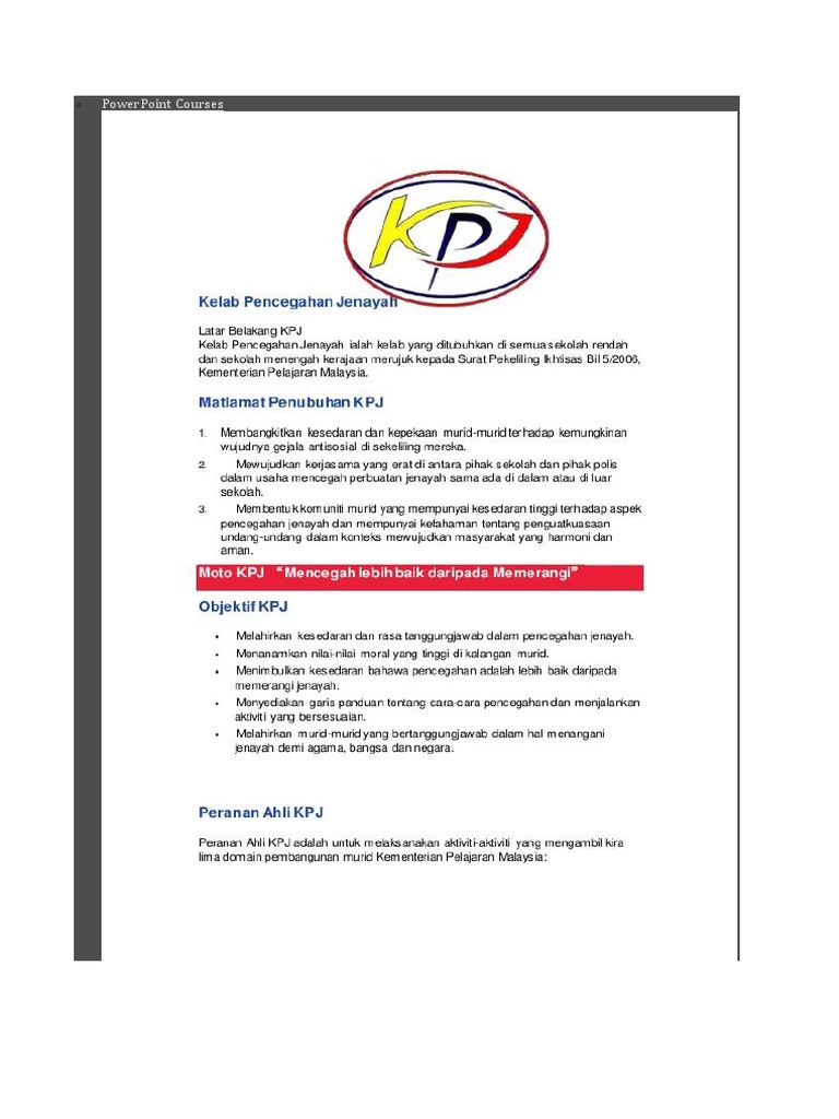 Panduan Kelab Pencegahan Jenayah from image.slidesharecdn.com Tak kenal maka tak cinta! Huruf k.p.j ialah singkatan kelab pencegahan jenayah. Portal rasmi pdt hulu selangor logo kelab sukan pdths. Huruf k.p.j ialah singkatan kelab pencegahan jenayah. Mencegah lebih baik daripada memerangi. Mewujudkan kerjasama yang erat di antara pihak sekolah dan pihak polis dalam usaha mencegah perbuatan jenayah sama ada di dalam atau di luar. Sekolah menengah kebangsaan sering, kota bharu, kelantan. Kelab pencegahan jenayah, sk chenderong kelubi, 31800 tanjung tualang perak.