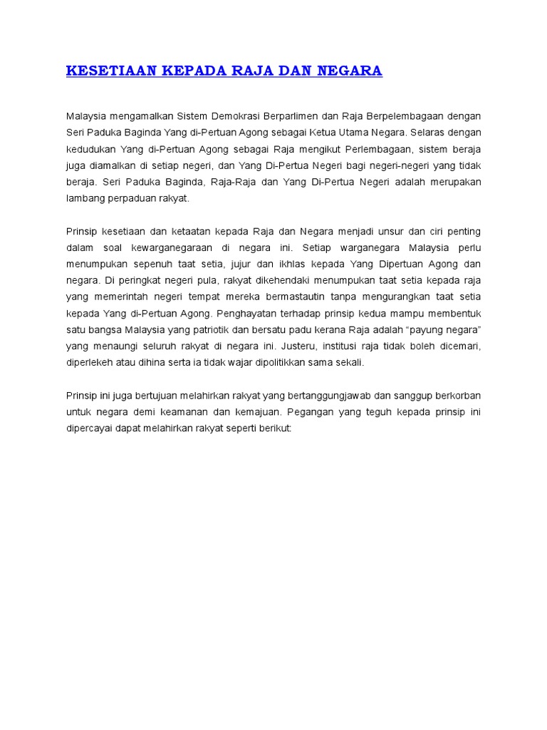 Taat Setia Kepada Raja Dan Negara : Pandangan sarwajagat menggambarkan sebuah negara yang mempunyai rakyat taat setia kepada siapa?. Kita juga harus mengenali raja dan pemimpin negara kita. Contact kesetiaan kepada raja dan negara on messenger. Contextual translation of taat setia kepada raja dan negara into english. Kita haruslah patuh dan setia kepada raja dan negara kita 2. Nilai ini mampu membentuk negara yang aman dan damai.
